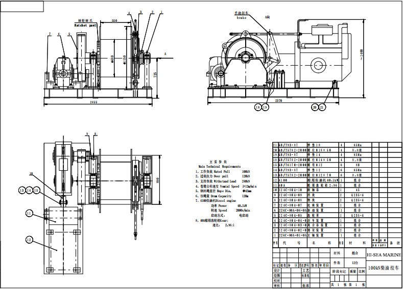 Drawing of 100 kN Diesel Engine Single Drum Winch