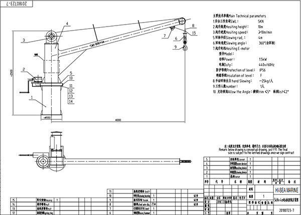 5kN Electric Fixed Boom Crane is designed for general cargo handling and use as marine, offshore, shipboard, and dock cranes. The term "fixed boom" indicates that the crane has a fixed-length boom that cannot be extended or retracted. This type of crane is often used in situations where a specific lifting height and reach is required. Without the knuckle function, it can't telescopic freely. Marine fixed boom cranes are available with electric motor.