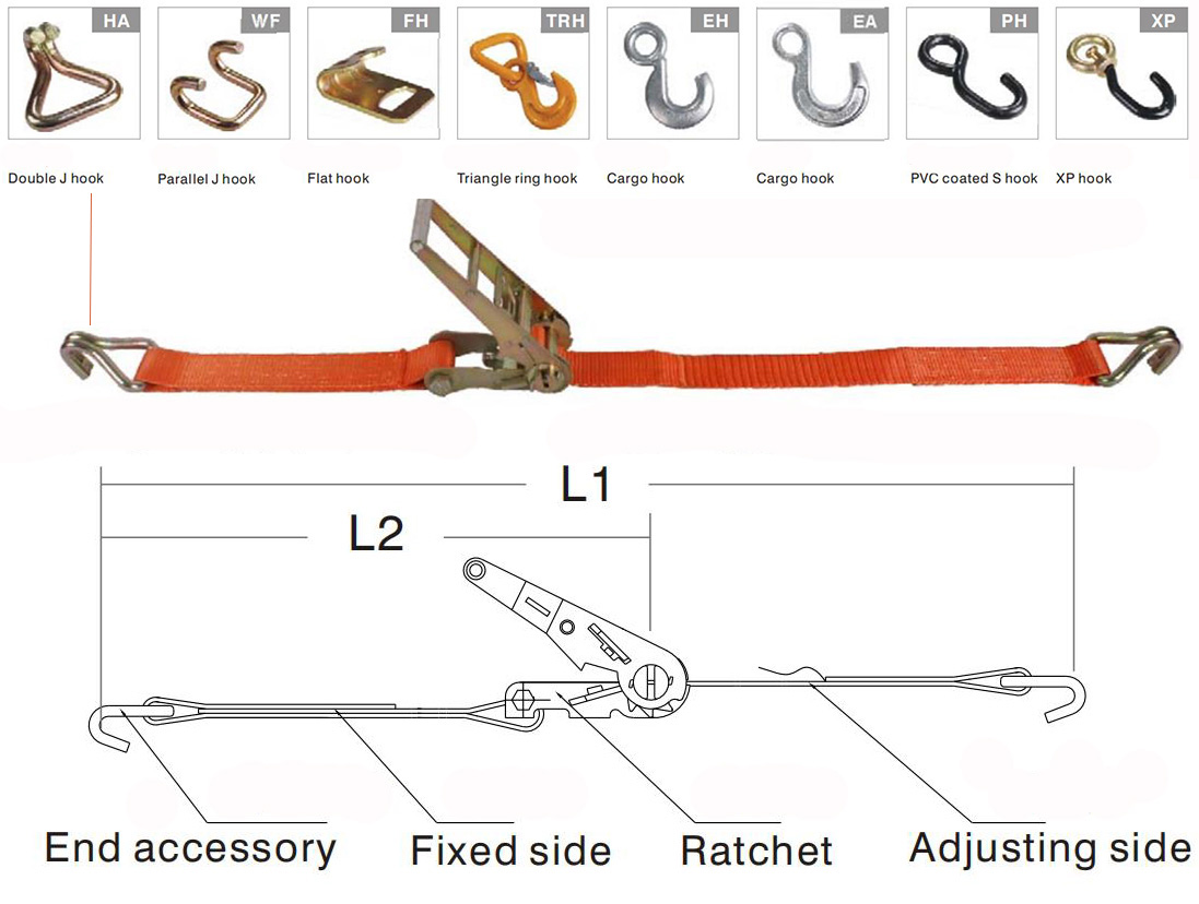 The ratchet strap sling is composed of flat webbing, fasteners and end metal parts. With its small size, light in weight, simple operation, convenient carrying, etc., it is mainly used for the fastening of items such as trucks, trailers, ships or rails, and the bundling of steel, wood and various pipe items. It is also suitable for vehicle trailers and Rescue use. But the ratchet strap sling cannot be used for lifting goods. And with various structures, it can be equipped with no end parts or other suitable end parts according to actual needs.