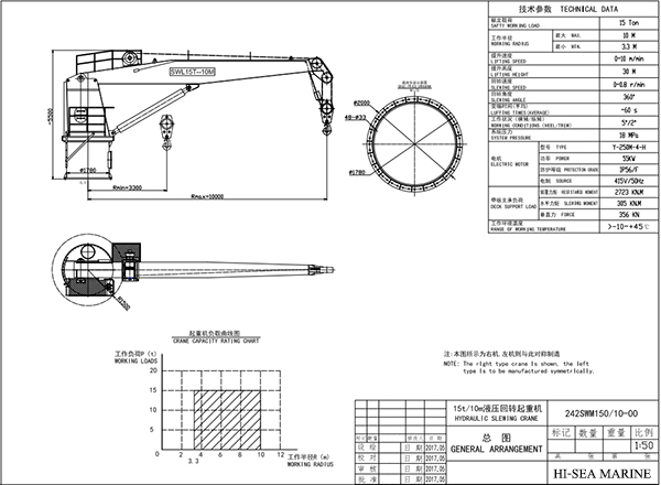 A 15T hydraulic slewing crane is a type of marine crane that is designed to lift and move heavy loads with precision and flexibility. The 15T indicates a lifting capacity of 15 metric tons or 33,000 pounds. Safety is a critical consideration when operating a 15T hydraulic slewing crane, as accidents can result in serious injury or damage to equipment. Proper training and maintenance are essential to ensure safe and efficient operation. The crane should also be equipped with safety features such as overload protection, emergency stop buttons, and warning signals. It is important to follow all relevant regulations and guidelines when using a hydraulic slewing crane, including those related to weight limits, load distribution, and crane stability.